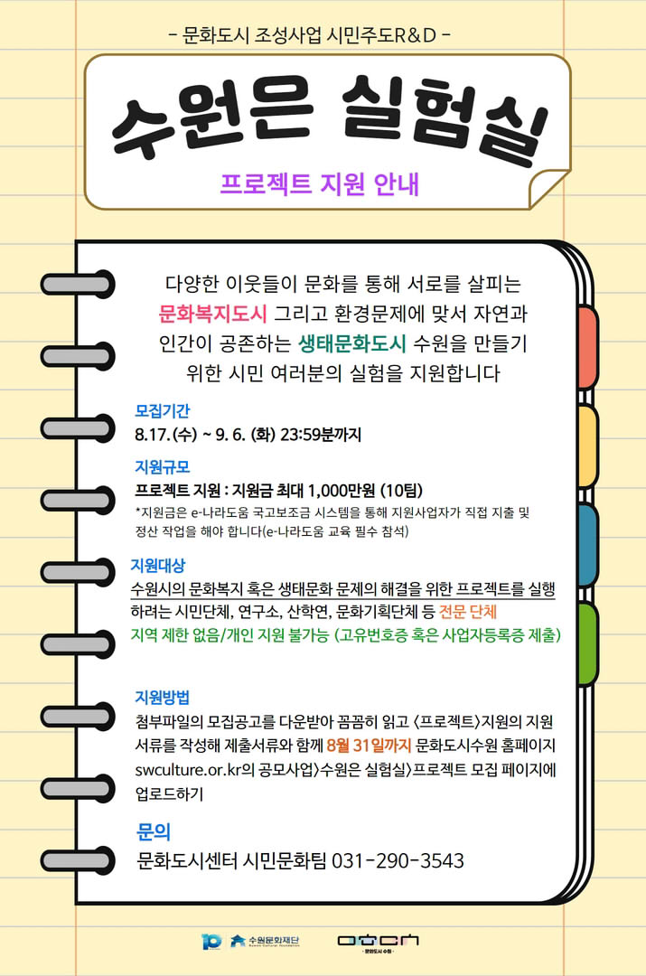 문화도시 조성사업 시민주도R&D- / 수원은 실험실 / 프로젝트 지원 안내 / 다양한 이웃들이 문화를 통해 서로를 살피는 문화복지도시 그리고 환경문제에 맞서 자연과 인간이 공존하는 생태문화도시 수원을 만들기 위한 시민 여러분의 실험을 지원합니다 / 모집기간 : 9. 6.(화) 23:59분까지 / 지원규모 : 프로젝트 지원:지원금 최대 1,000만원(10팀) *지원금은 e-나라도움 국고보조금 시스템을 통해 지원사업자가 직접 지출 및 정산 작업을 해야합니다(e-나라도움 교육 필수 참석) / 지원대상 : 수원시의 문화복지 혹은 생태문화 문제의 해결을 위한 프로젝트를 실행 하려는 시민단체, 연구소, 산학연, 문화기획단체 등 전문 단체 / 지역 제한없음/개인 지원 불가능 / 지원방법 : 첨부파일의 모집공고를 다운받아 꼼꼼히 읽고 <프로젝트>지원의 지원 서류를 작성해 제출서류와 함께 8월31일까지 문화도시수원 홈페이지 swculture.or.kr의 공모사업>수원은 실험실>프로젝트 모집 페이지에 업로드하기 / 문의 : 문화도시센터 시민문화팀 031-290-3543