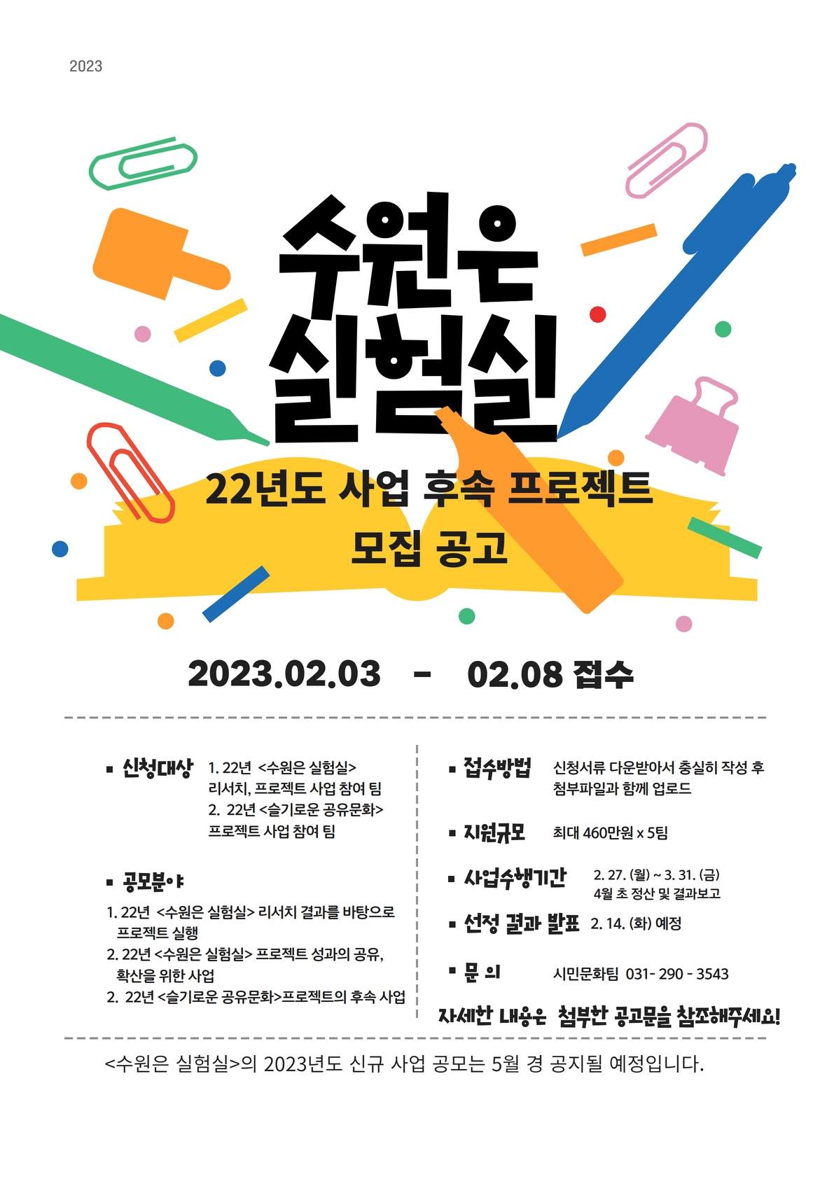 (붙임 1) 2023 수원은 실험실 후속지원사업 모집 공고(0203).pdf (붙임 2) 2023 수원은 실험실 후속 프로젝트 지원서 양식.hwp |