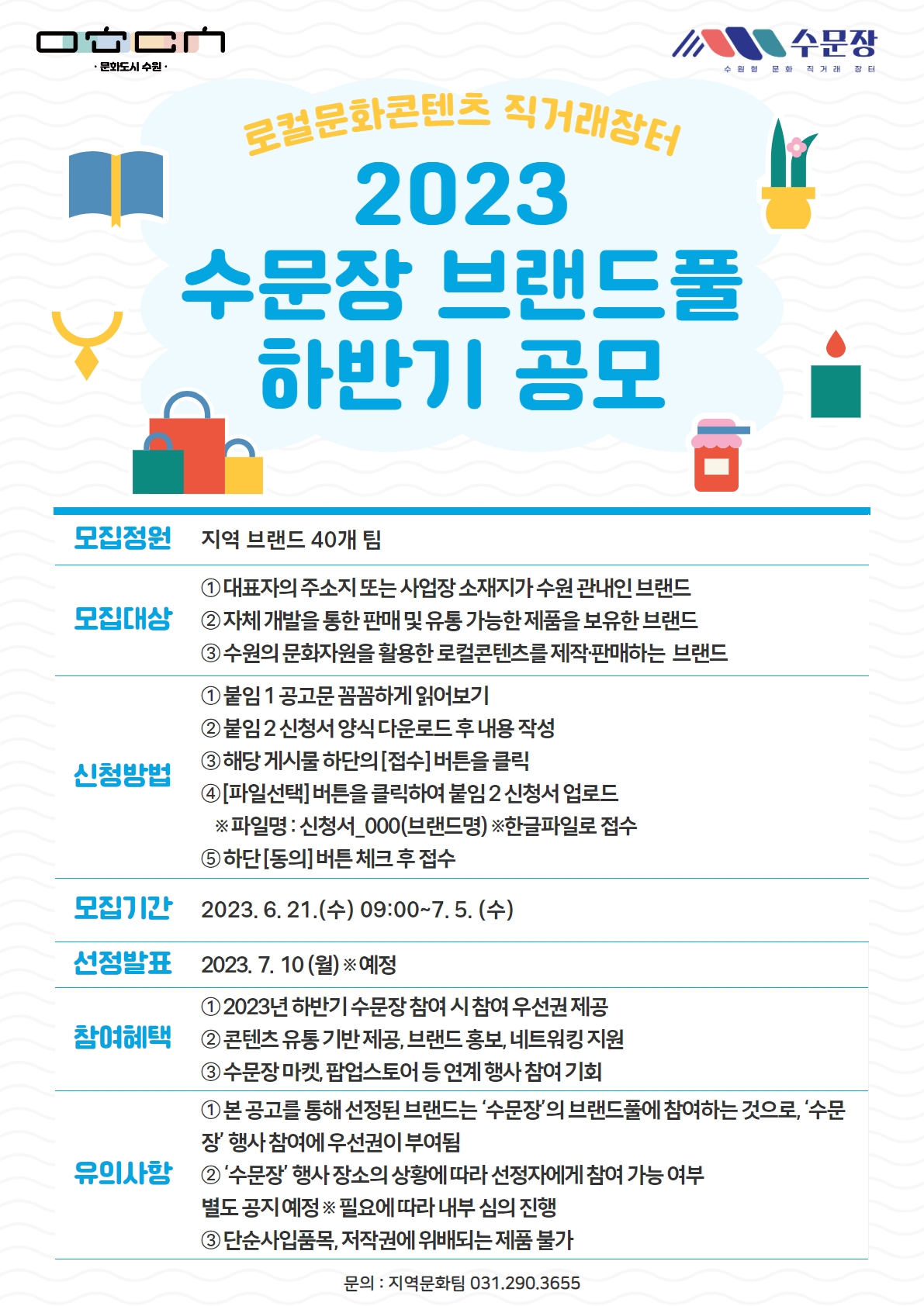 (재)수원문화재단에서는 고유한 자원과 문화적 특성을 기반으로 콘텐츠를 생산하는 지역 브랜드를 소개하고 브랜드 창작자 간 협력과 소비자와의 교류를 도모할 수 있는 로컬문화콘텐츠 직거래 장터 <수문장> 행사에 지속적으로 참여할 브랜드를 모집합니다. 지역 창작자와 브랜드의 많은 참여 부탁드립니다.
