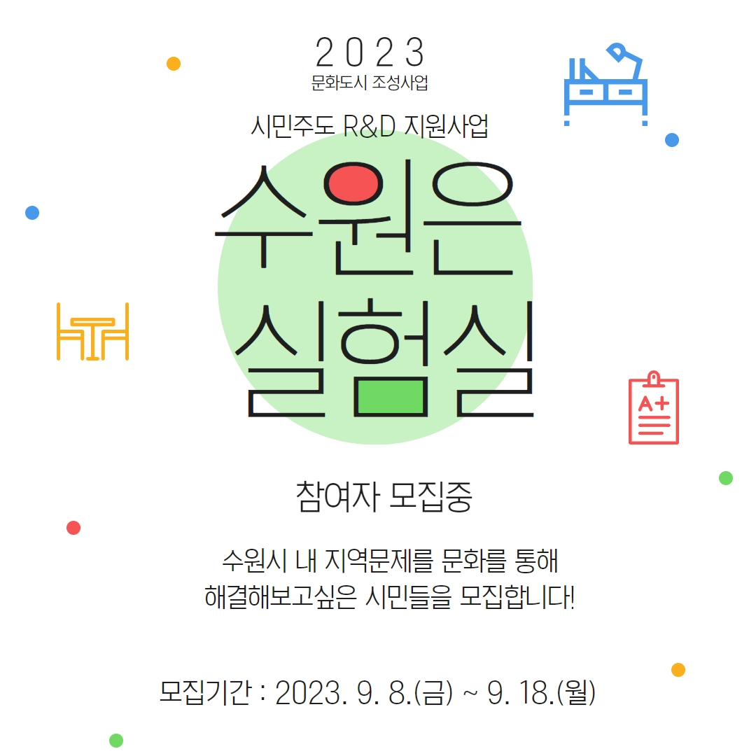 | 제목 | 2023 시민주도 R&D <수원은 실험실> - 프로젝트형 참여자 모집 공고 | ||