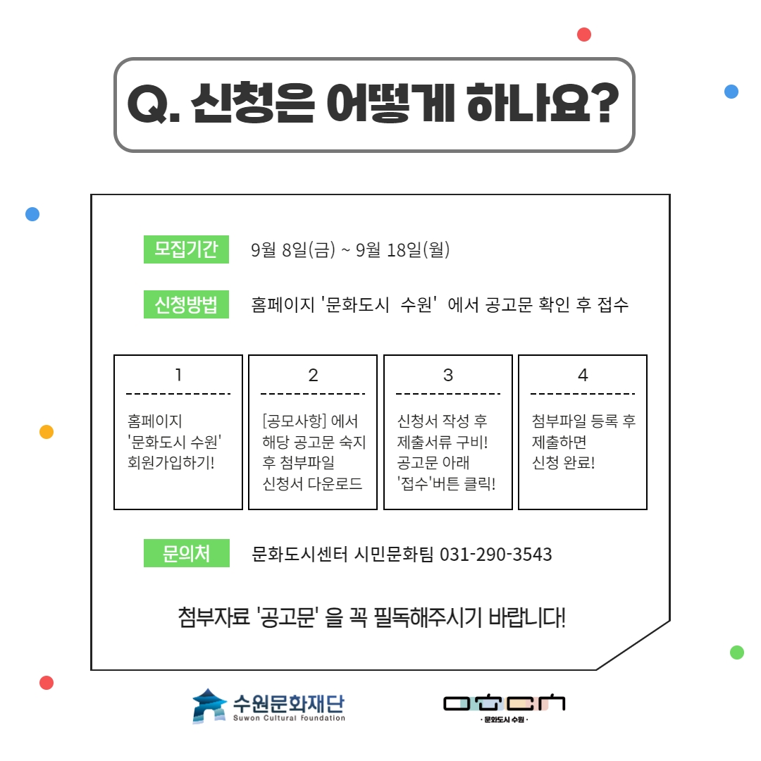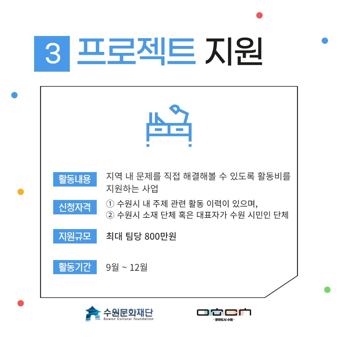 (재)수원문화재단은 문화를 통해 지역 문제를 주체적으로 해결하고자 하는 시민들을 다음과 같이 모집하오니, 많은 관심과 참여 바랍니다.