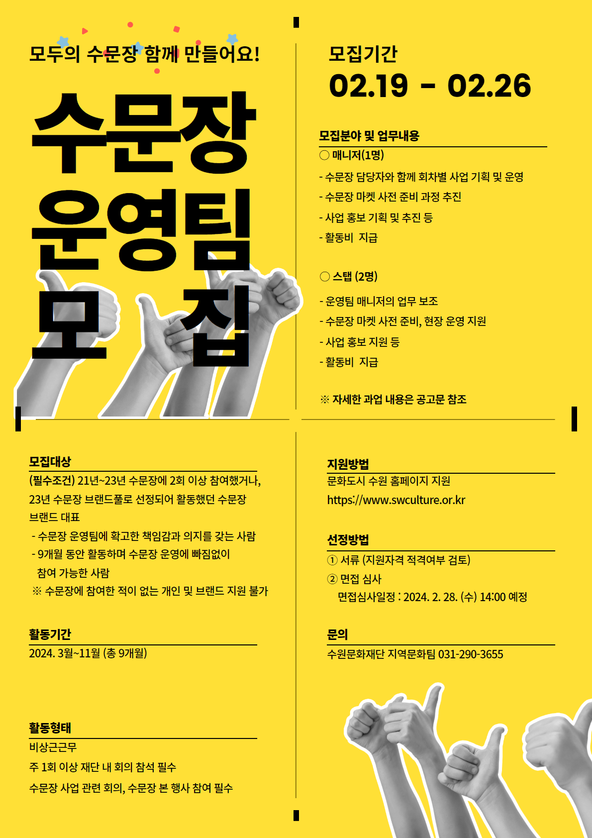 (재)수원문화재단 문화도시센터에서는 지역문화콘텐츠의 소개 및 판로 확장을 추진하는 로컬브랜드 활성화 사업 ‘수문장’ 마켓을 운영하고 있습니다. 지속가능한 수문장 운영을 위해 수문장 참여 브랜드를 대상으로 운영팀을 모집하오니 수문장 브랜드의 많은 참여를 바랍니다.