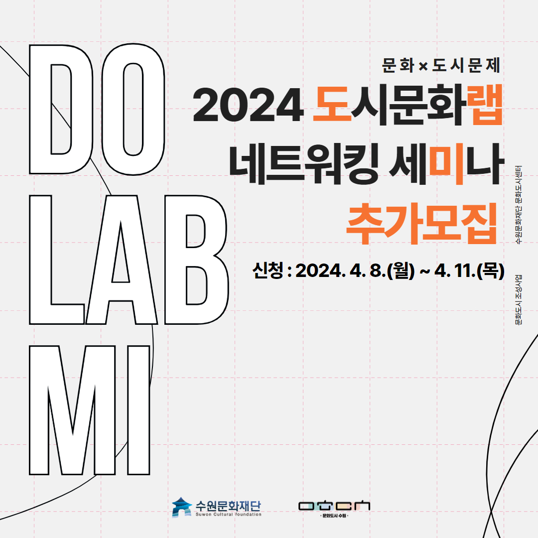 | 제목 | 2024 문화도시 수원 도시문화랩 네트워킹 세미나 <도랩미> 신청기간 연장 안내 | ||