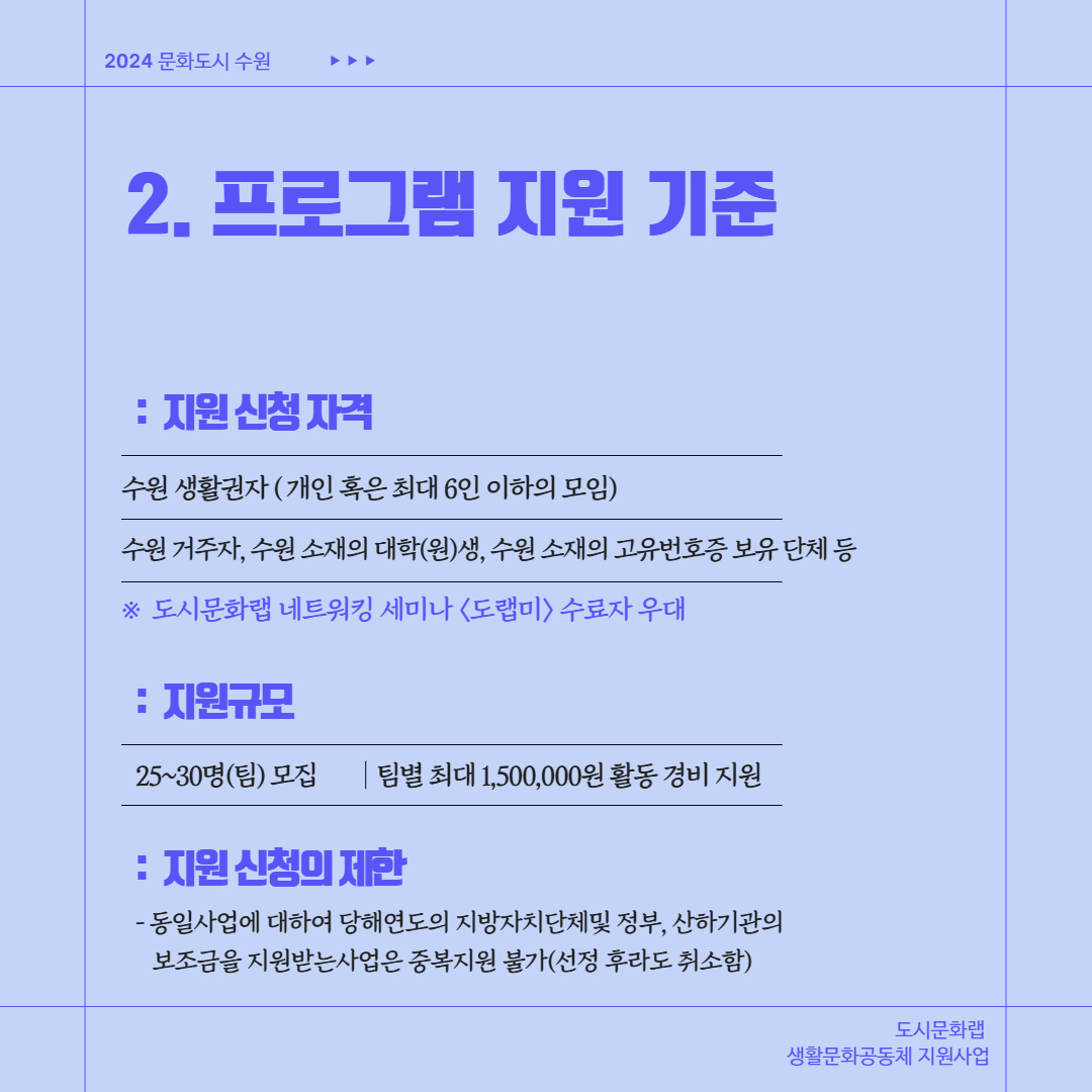 ※ 수원 거주자, 수원 소재의 대학(원)생, 수원 소재로 고유번호증 보유한 비영리단체 등